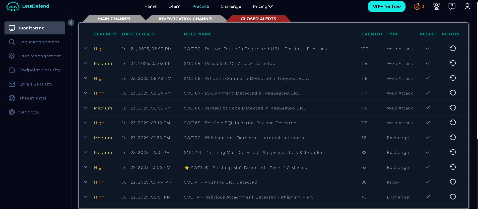 Closed alerts on lets defend SOC lab