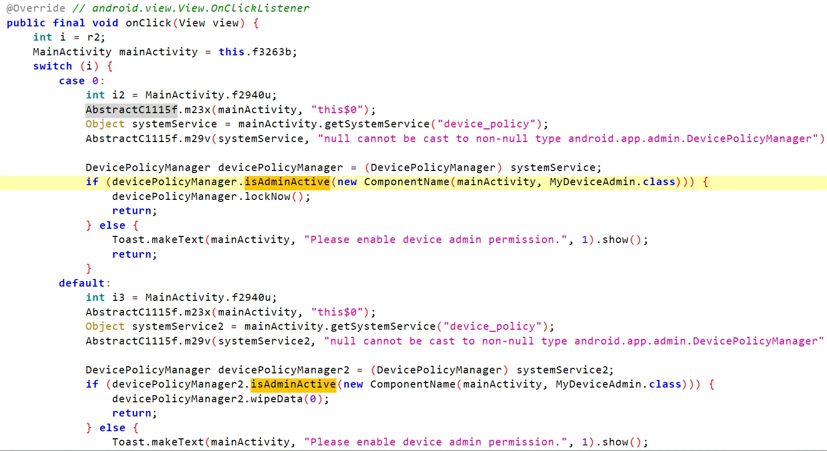 Search For isAdminActive or functions which usually used like resetPassword, lockNow, wipeData.