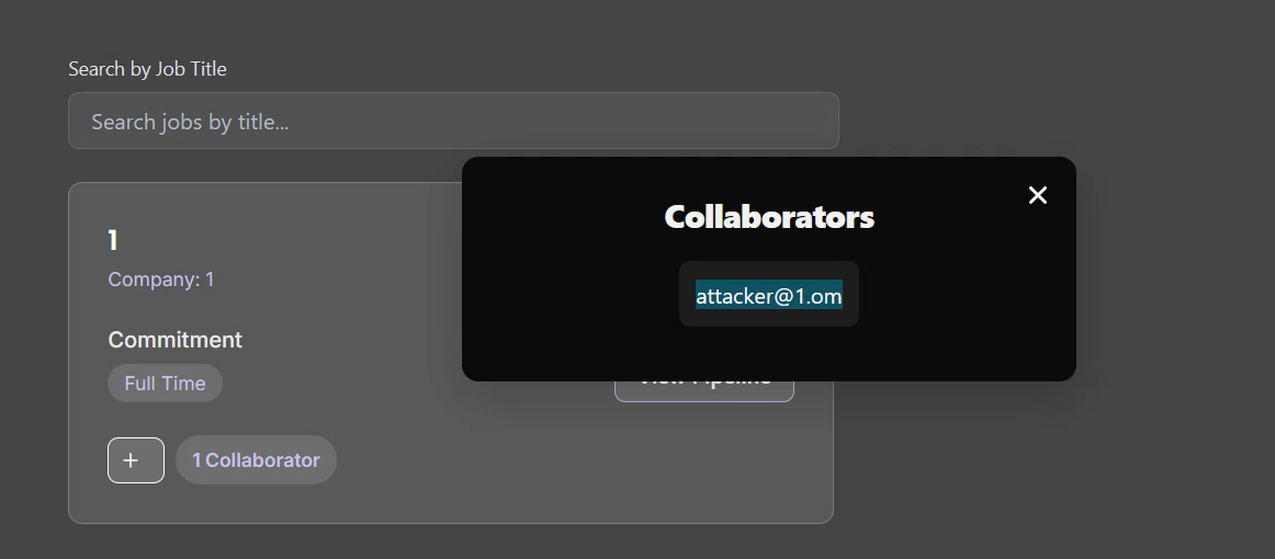 An authenticated attacker can add themselves (or any arbitrary email) as a collaborator to any job by modifying the jobId parameter in the collaborator-add API (POST /api/collab/addNew), resulting in unauthorized access to job resources, candidate data, and internal workflows.