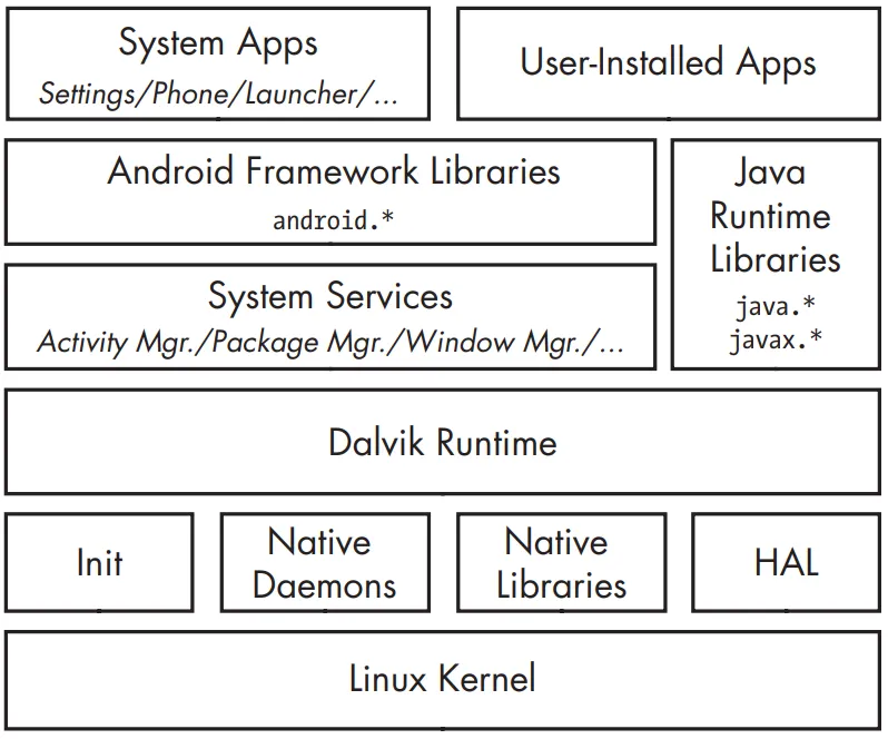 On top of the kernel is the native user-space layer, consisting of the init binary (the first process started, which starts all other processes), several native daemons, and a few hundred native libraries that are used throughout the system. While the presence of an init binary and daemons is reminiscent of a traditional Linux system, note that both init and the associated startup scripts have been developed from scratch and are quite different from their mainline Linux counterparts.