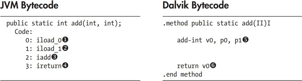 Here, the JVM uses two instructions to load the parameters onto the stack (u and v), then executes the addition w, and finally returns the result x. In contrast, Dalvik uses a single instruction to add parameters (in registers p0 and p1) and puts the result in the v0 register y. Finally, it returns the contents of the v0 register z. As you can see, Dalvik uses fewer instructions to achieve the same result. Generally speaking, register-based VMs use fewer instructions, but the resulting code is larger than the corresponding code in a stack-based VM. However, on most architectures, loading code is less expensive than instruction dispatch, so register-based VMs can be interpreted more efficiently.