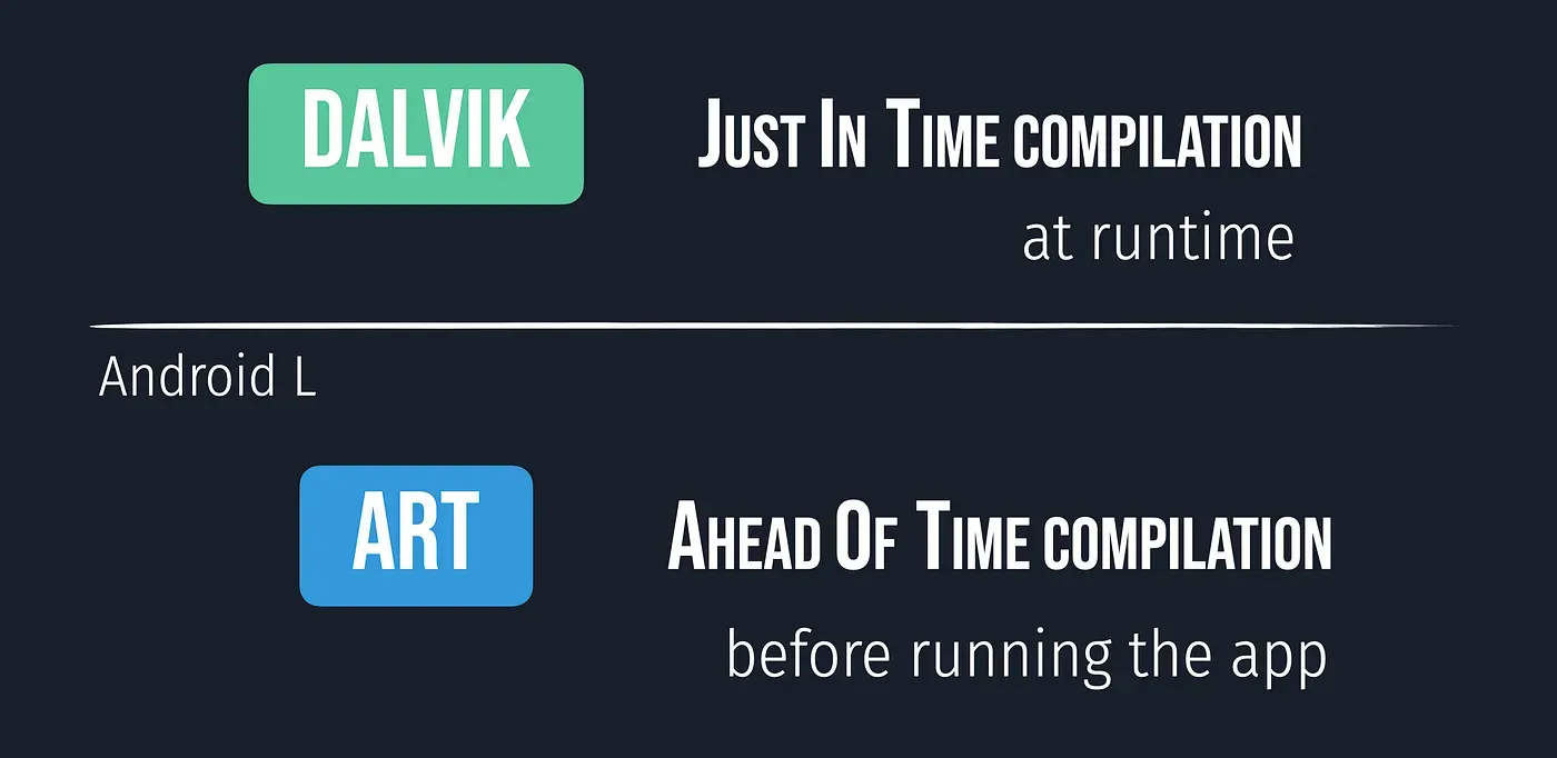 As the size of applications grew and phones became more powerful, Dalvik became more outdated and the user could see performance lagging. ART was created to fix the growing concerns. The major change with ART was the change from JIT compilation to ahead of time compilation(AOT). Instead of compiling code at runtime, code is compiled before running the app. This gave a large performance boost. ART still uses the .dex files, however, it gives us further optimizations to improve performance for the user. Some of the features introduced in ART are: