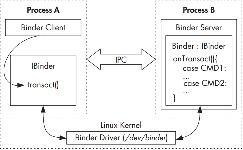 As mentioned previously, Binder is an inter-process communication (IPC) mechanism. Before getting into detail about how Binder works, let’s briefly review IPC. As in any Unix-like system, processes in Android have separate address spaces and a process cannot directly access another process’s memory (this is called process isolation). This is usually a good thing, both for stability and security reasons: multiple processes modifying the same memory can be catastrophic, and you don’t want a potentially rogue process that was started by another user to dump your email by accessing your mail client’s memory. However, if a process wants to offer some useful service(s) to other processes, it needs to provide some mechanism that allows other processes to discover and interact with those services. That mechanism is referred to as IPC. The need for a standard IPC mechanism is not new, so several options predate Android. These include files, signals, sockets, pipes, semaphores, shared memory, message queues, and so on. While Android uses some of these (such as local sockets), it does not support others (namely System V IPCs like semaphores, shared memory segments, and message queues).