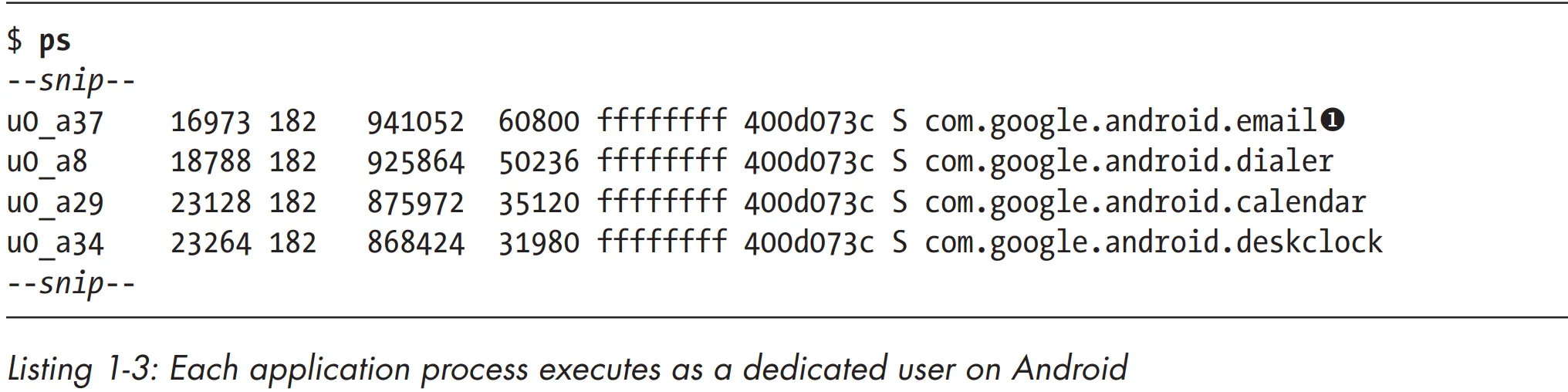 System daemons and applications run under well-defined and constant UIDs, and very few daemons run as the root user (UID 0). Android does not have the traditional /etc/password file and its system UIDs are statically defined in the android_filesystem_config.h header file. UIDs for system services start from 1000, with 1000 being the system (AID_SYSTEM) user, which has special (but still limited) privileges. Automatically generated UIDs for applications start at 10000 (AID_APP), and the corresponding usernames are in the form app_XXX or uY_aXXX (on Android versions that support multiple physical users), where XXX is the offset from AID_APP and Y is the Android user ID (not the same as UID). For example, the 10037 UID corresponds to the u0_a37 username and may be assigned to the Google email client application (com.google.android.email package). Listing 1-3 shows that the email application process executes as the u0_a37 user u, while other application processes execute as different users.