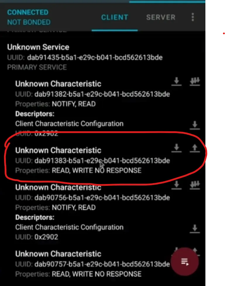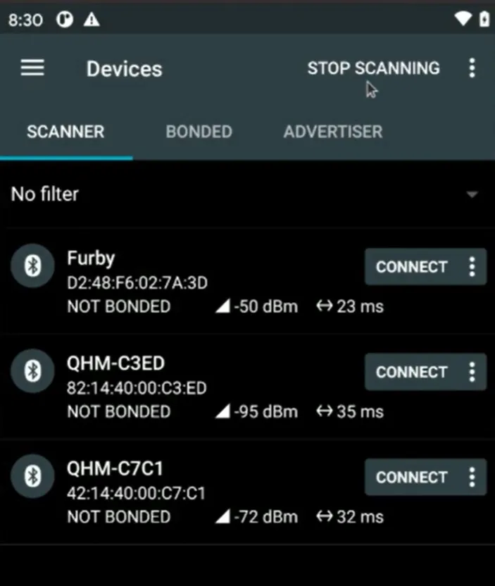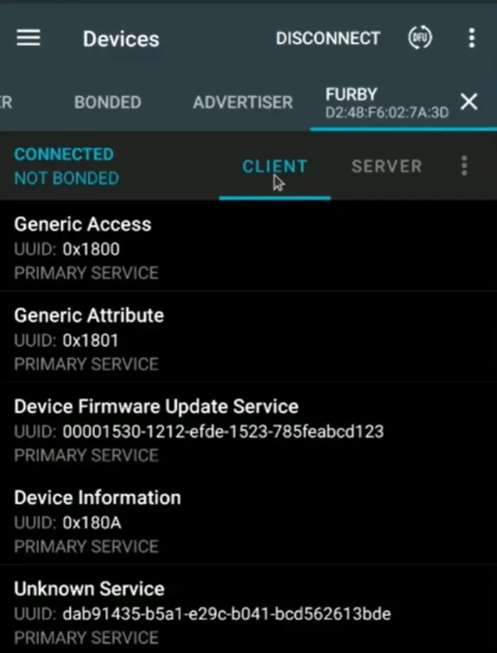 To hacking our sample device (furby) we should first connect to it. After that you can see list of services which is available for interact: