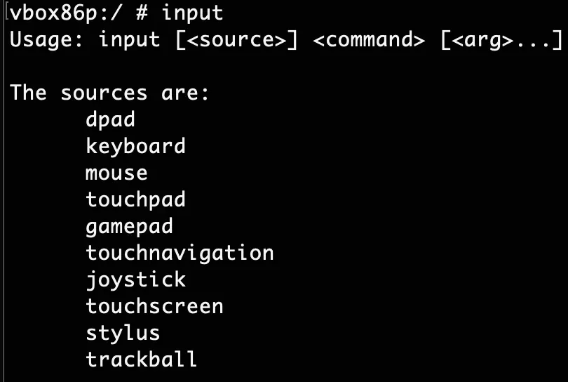 If you open adb shell command you will getting a shell from your phone. In this state enter input and press Enter key.