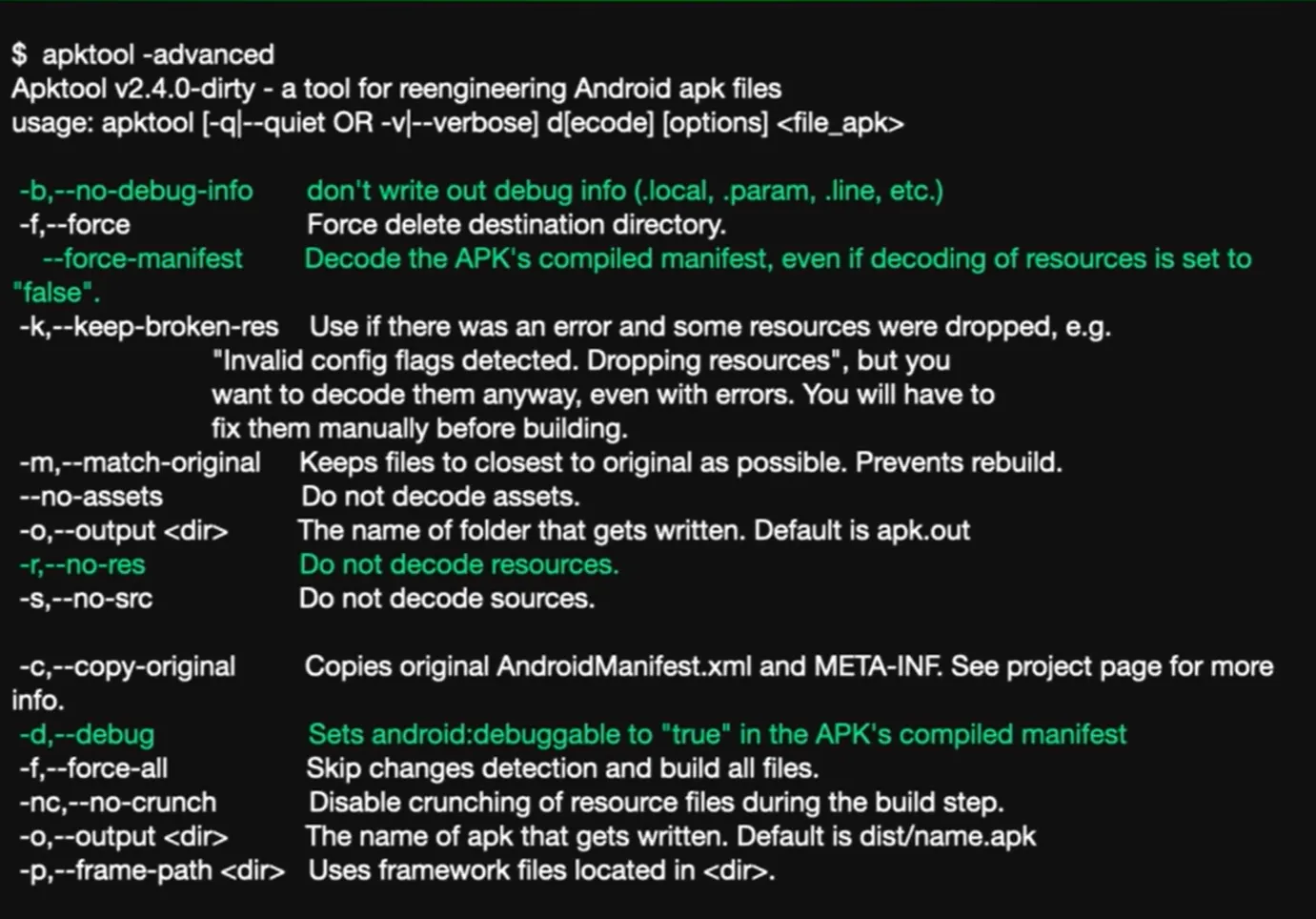 - Decode the APK’s compiled manifest, even if decoding of resources is set to “false”.